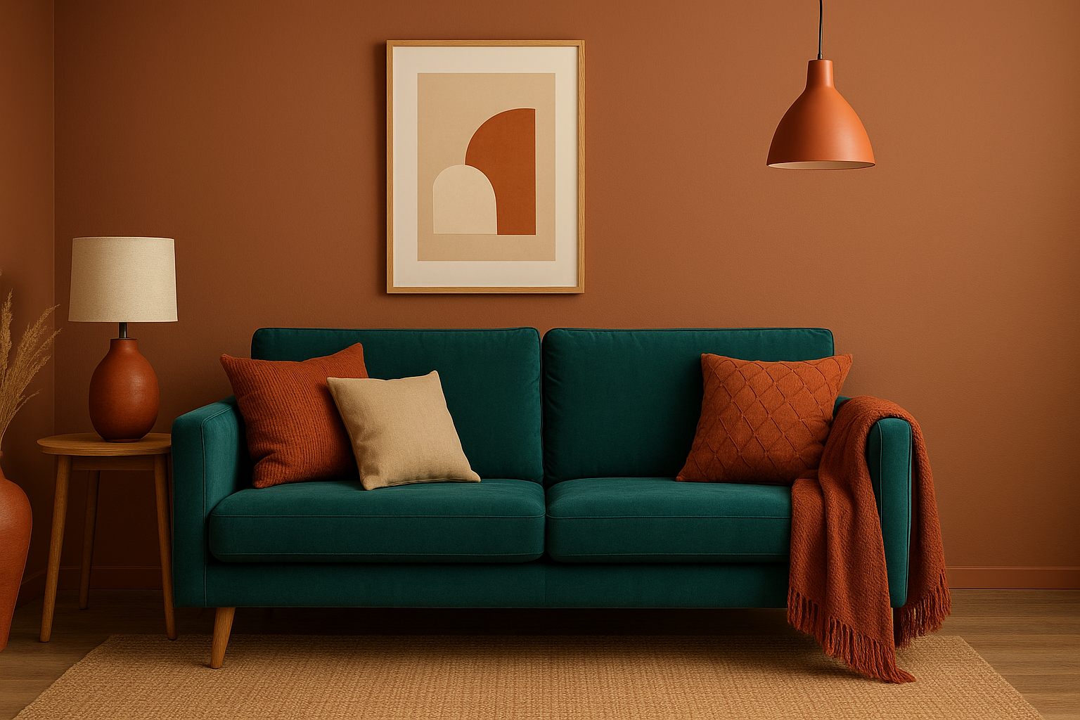 Canapé bleu moderne avec coussins beige et terracotta, plaid et lampe design dans un salon à la décoration intérieure chaleureuse